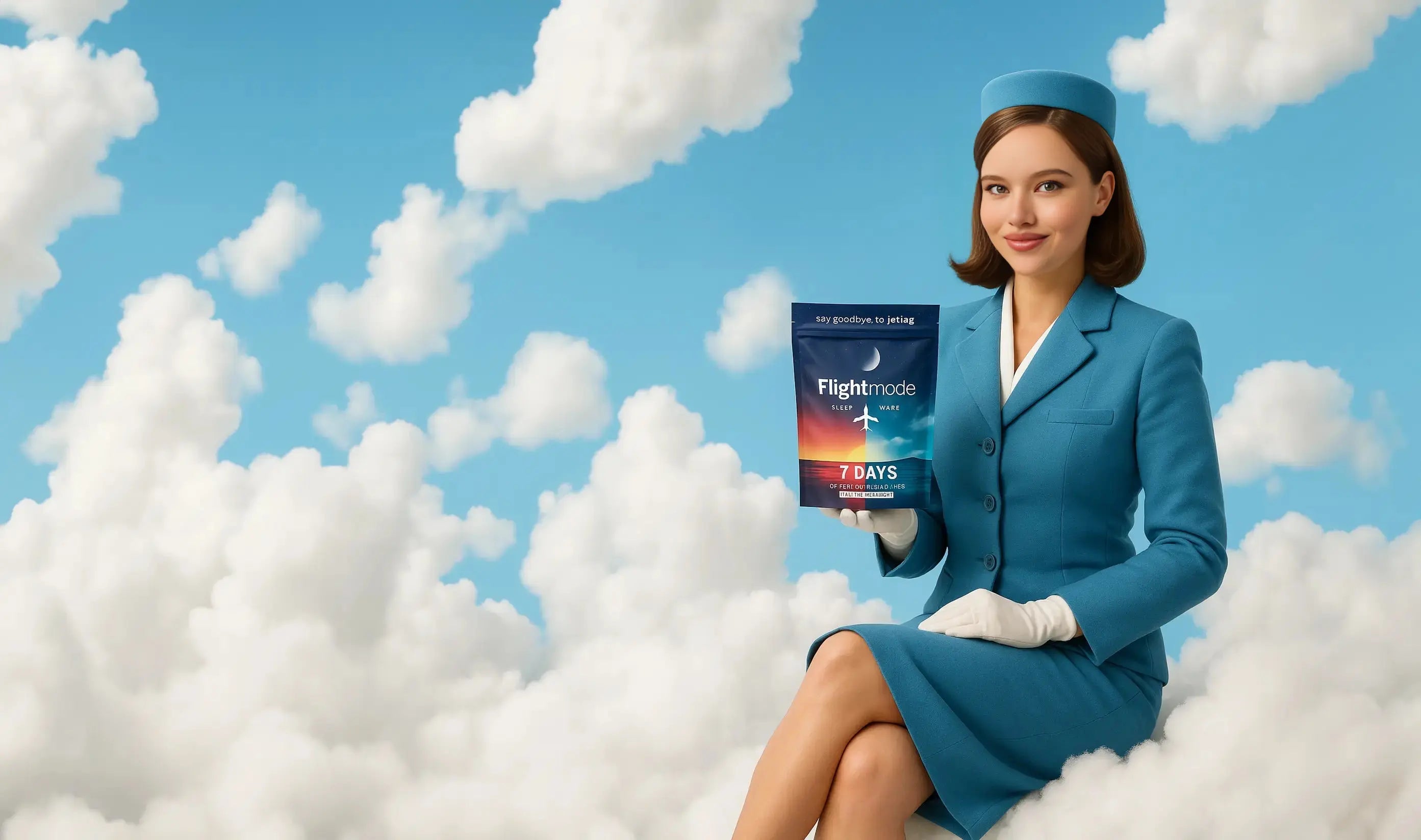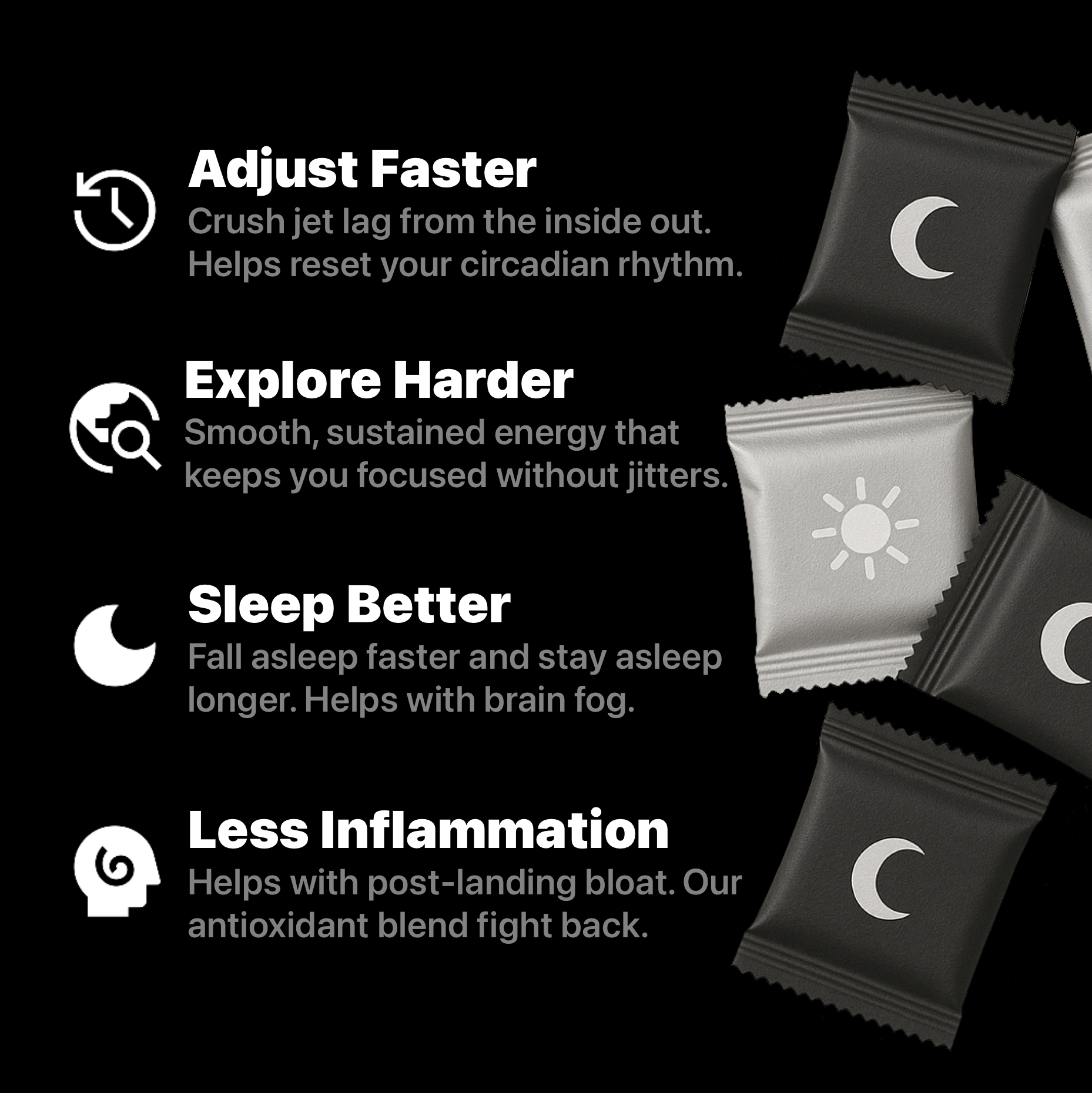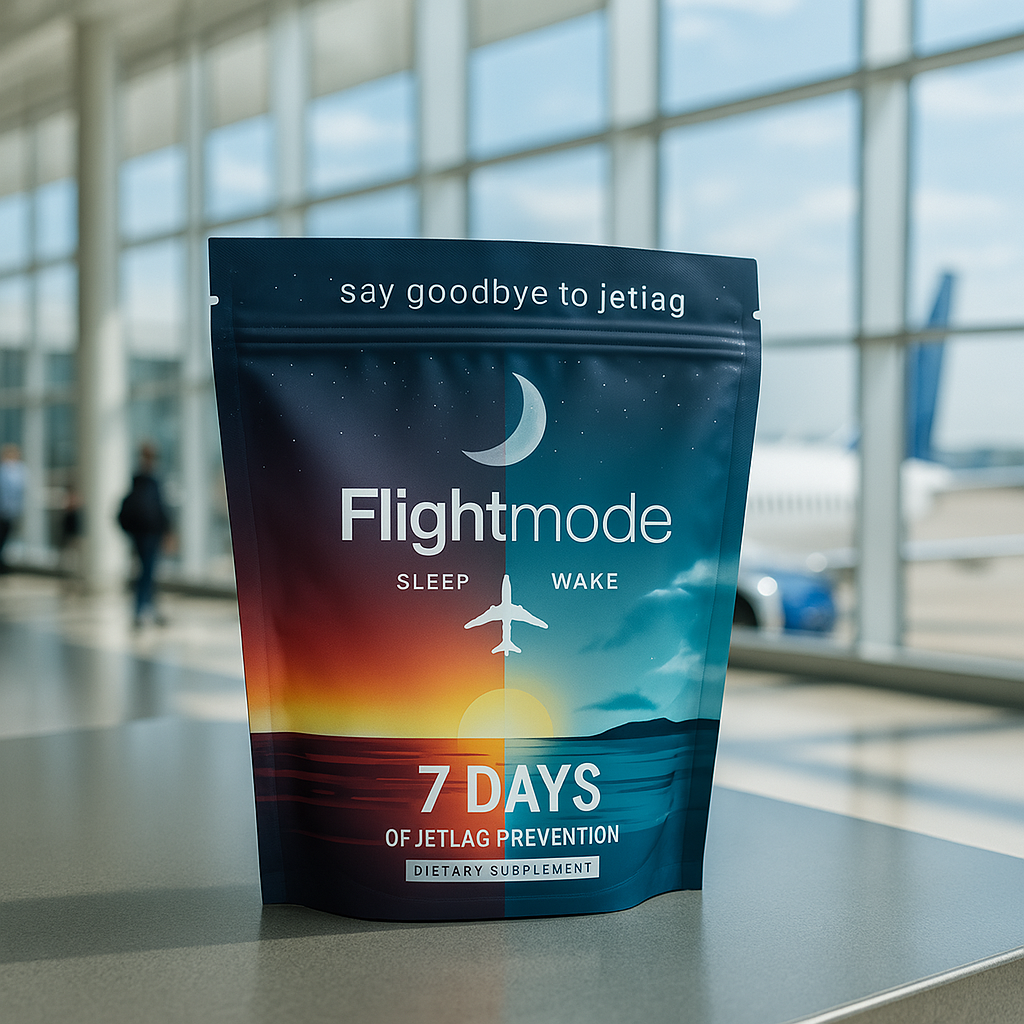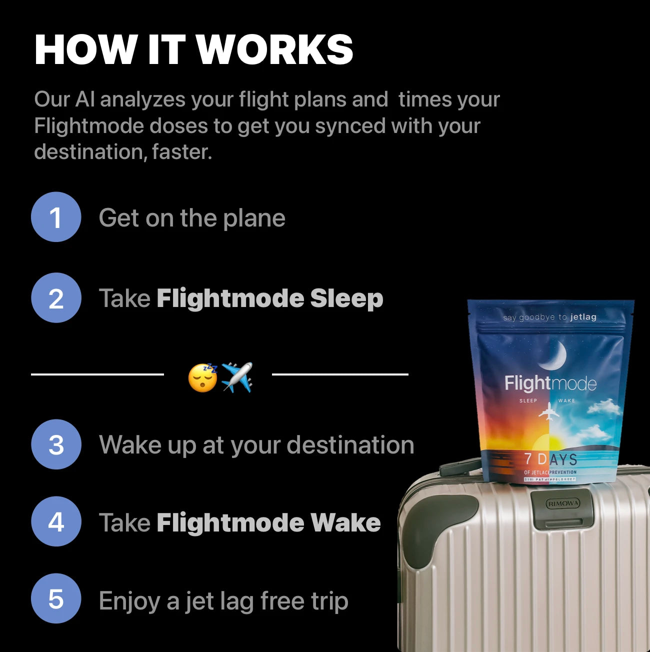 You just landed in Paris, but your brain's still back in New York. You're spending the first few days of your trip in bed, wasting time. Flightmode fixes that. No sketchy sleeping pills. No sugar-loaded energy drinks. Just clean, targeted support to help your body adapt to your destination, FAST.