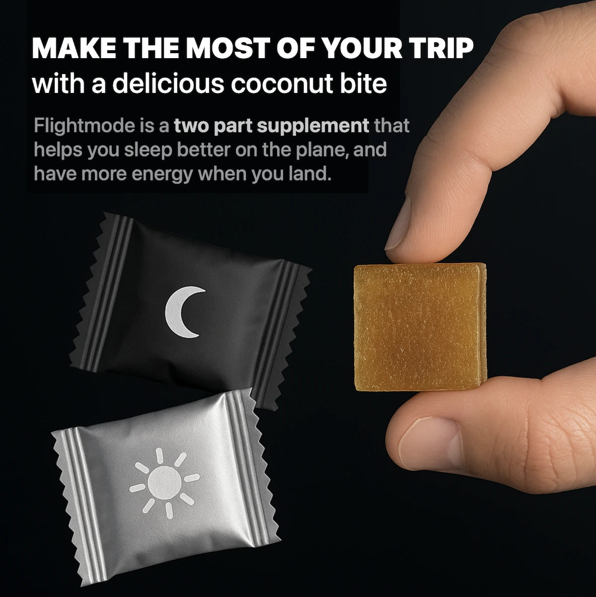 Skip the sketchy melatonin cocktails. Flightmode coconut bites hit harder with real, science-backed ingredients that help you conquer jet lag and stay in rhythm, naturally without habit forming synthetic ingredients.